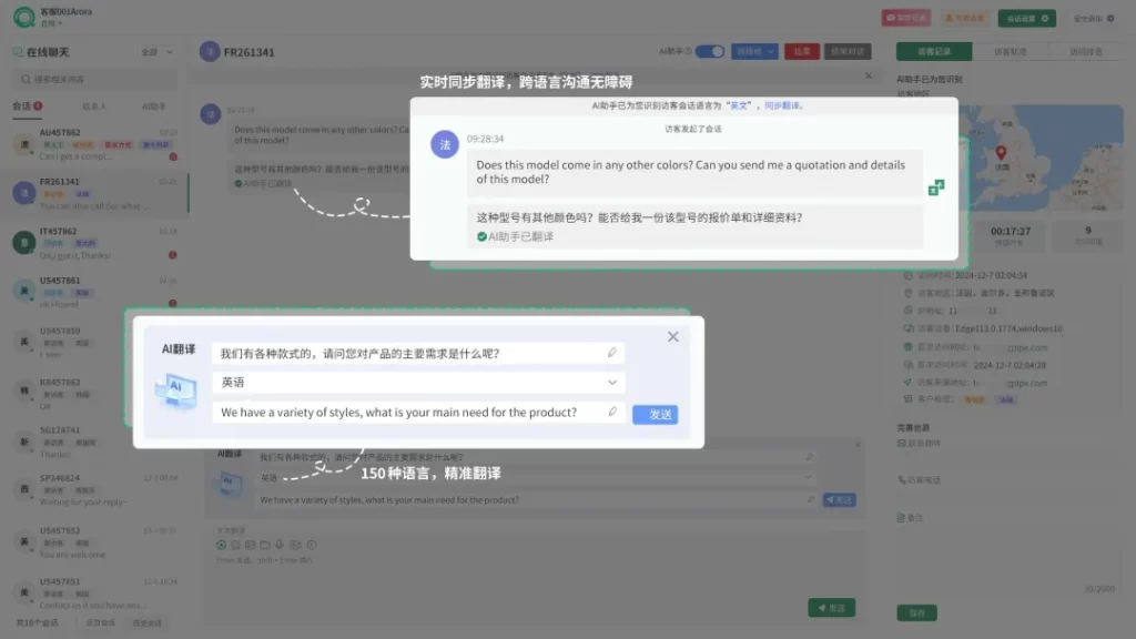 除了流量获取,沟通环节的痛点也通过AI技术得以破解。何总向记者展示了思亿欧外贸快车的AI客服功能,不仅支持150种语言的实时互译,还能提供7×24小时秒级响应。这相当于为企业配备了一名永不休息、精通多国语言的全球销售助理,从根本上解决了时差与语言障碍带来的询盘流失问题。